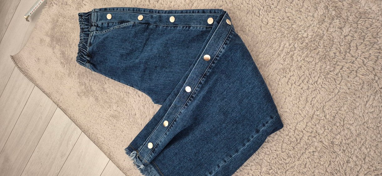 Düğmeli detaylara sahip, gri renkte, bol kesim kadın denim midi jean. Günlük kullanım için uygun, rahat sokak stili jean. m beden uyumlu
