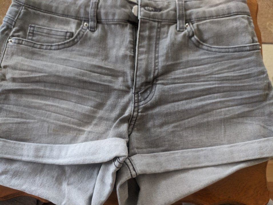 Düğmeli, midi boy gri denim şort, rahat ve günlük sokak tarzına uygun.