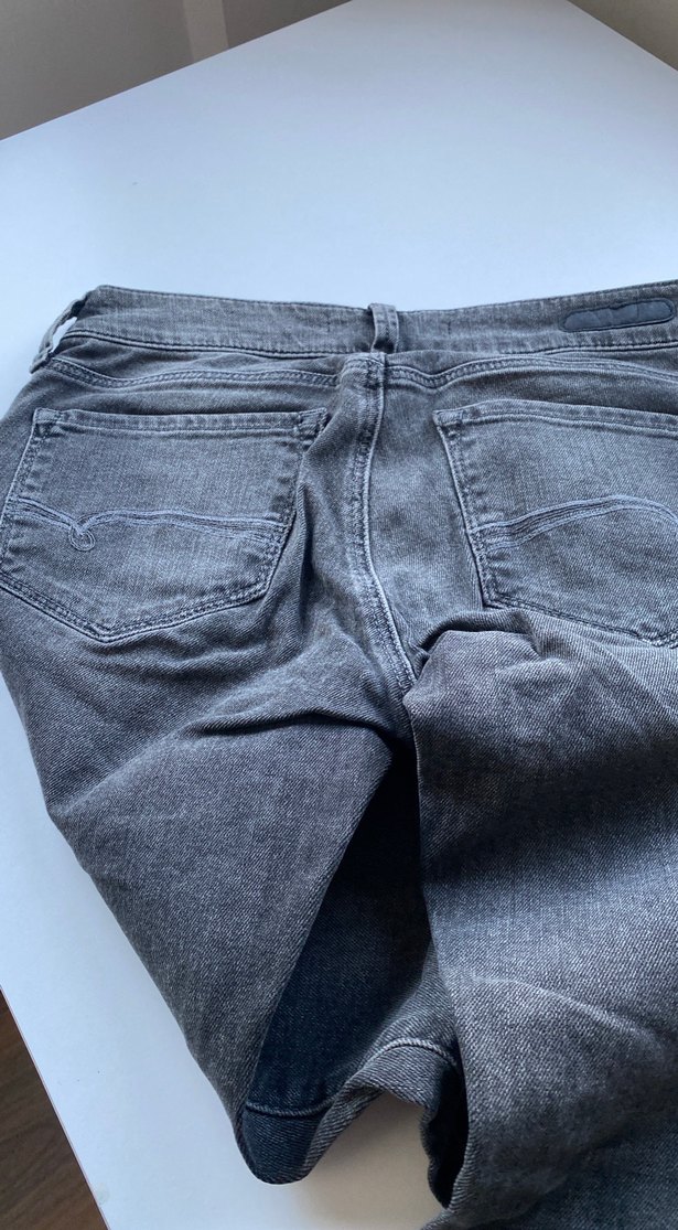 Düğmeli önde, ve normal boyda gri denim pantolon, gündelik rahat kullanım için uygundur.