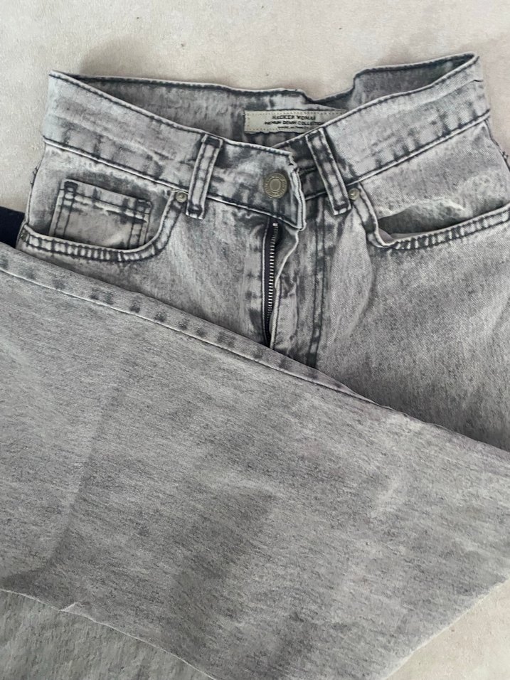 Düğmeli kapamalı, gri renkli, regular fit kadın denim pantolon. Sokak stiline uygun, normal midi boyda, günlük kullanıma uygun.