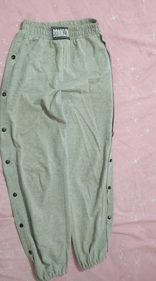 Yanları düğmeli, rahat kesim gri kadın eşofman altı. Yumuşak ve sıcak kumaştan, günlük kullanım için uygun.