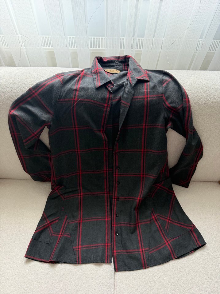 Düğmeli ve uzun kollu bu kadın gömlek, kesik yaka detayına sahiptir. Regular fit ve midi boyda, sentetik kumaştan üretilmiştir. Koyu gri renk ve ince kırmızı çizgilerle günlük rahat bir tarz sunar.
