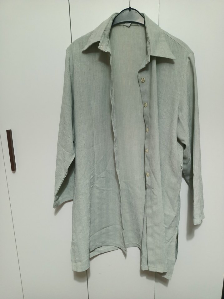 Gri renkte, uzun kollu ve düğmeli kadın gömleği. Minimalist tarzda, rahat kesim ve notched yaka detayına sahiptir.