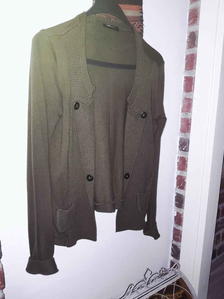 Haki renkli kadın hırka, yumuşak yün kumaştan, düğmeli ve cepli, blezir kesim ve uzun kolludur. Günlük kullanıma uygundur.