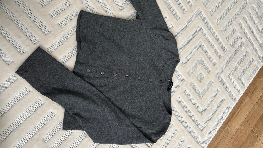 Düğmeli, uzun kollu ve yuvarlak yakalı, gri renkte ve yumuşak sentetik kumaştan yapılmış, günlük kullanıma uygun, rahat ve dar kesim kadın hırkasıdır.
