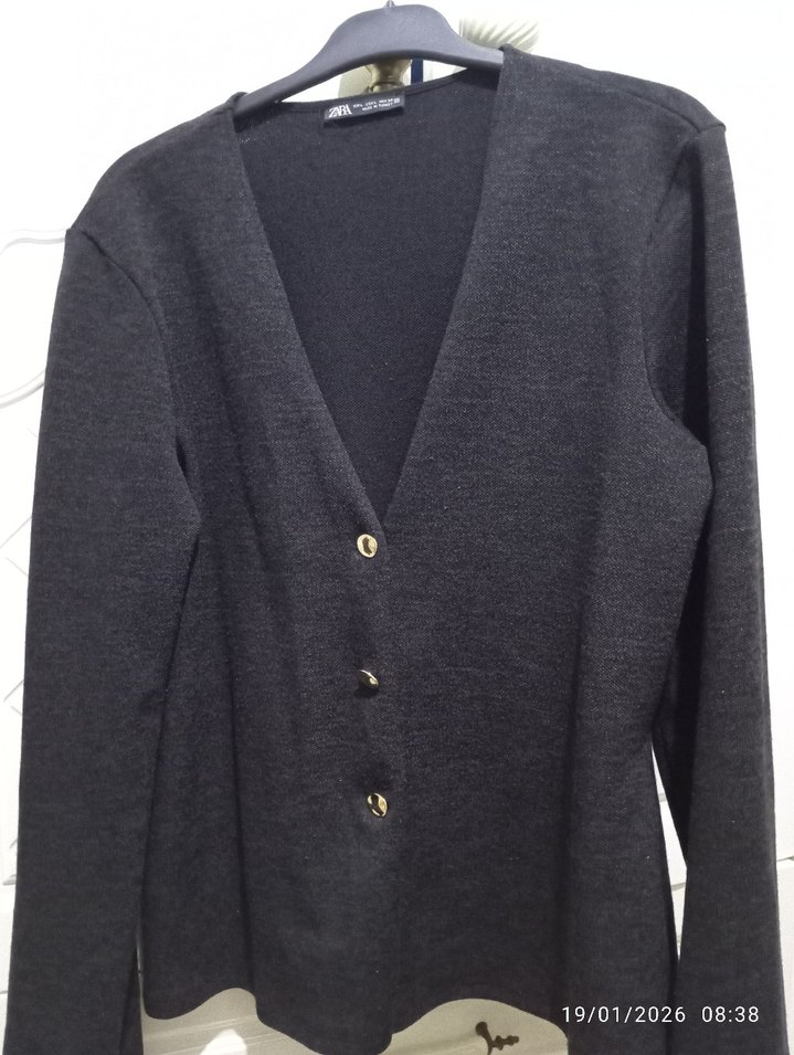 SATILDI Gri yün hırka, düğmeli ve uzun kolludur. Notlu yaka ve bol kesimle günlük kullanıma uygundur. Midi boyda ve desensizdir.