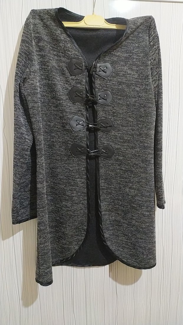 Gri renkli, düğmeli, notched lapel yakalı, uzun kollu ve bol kesim midi uzunlukta örme kadın hırkasıdır. Rahat kullanıma uygundur.