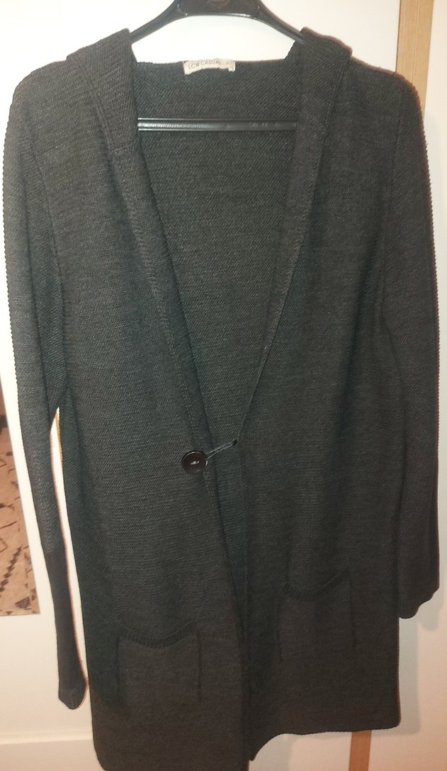 Düğmeli, gri yün kadın hırka. Notched lapel yakalı, uzun kollu ve midi boyda, rahat kesimdir. Günlük kullanıma uygundur. Enseden aşağı 100cm, kolaltindan kolaltina 50cmdir.