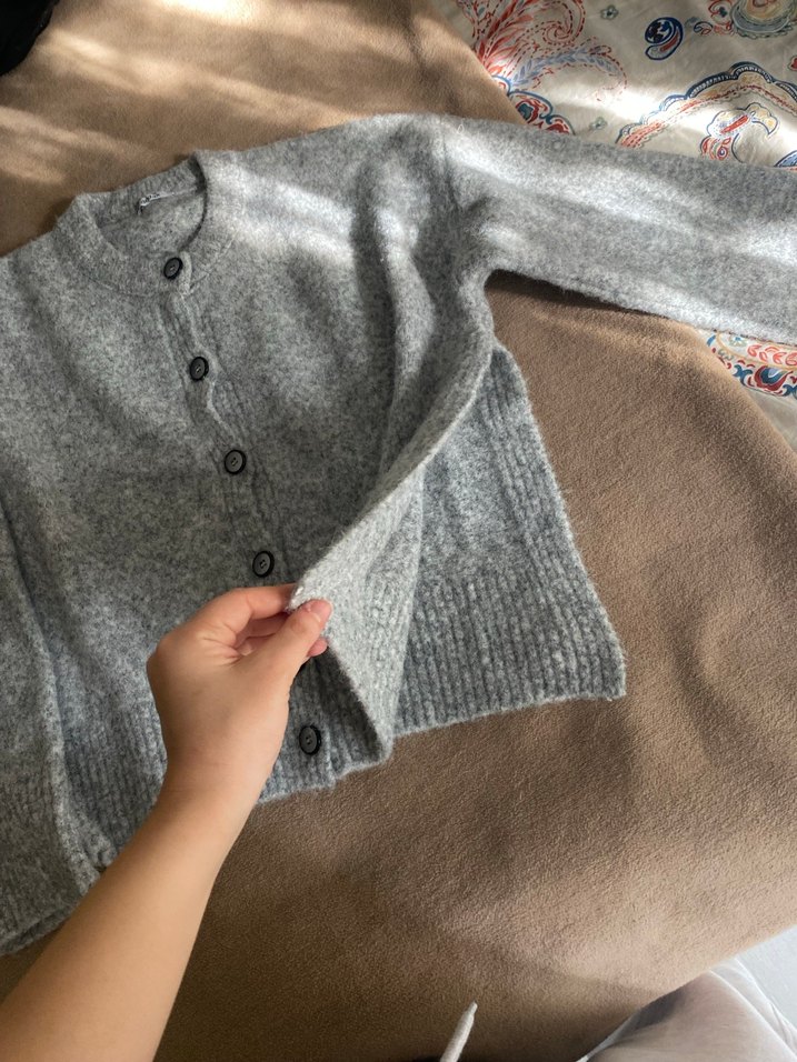 Gri renkte, düğmeli, yuvarlak yakalı, uzun kollu ve bol kesim örme kadın hırka. Normal midi boyda, sade ve rahat bir tarz sunar. Kenarlarında yırtmaç var standart beden addax marka