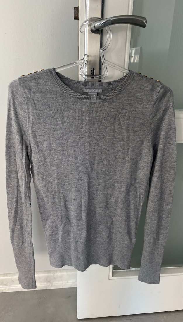 Düğmeli omuz detaylı, uzun kollu, gri yün ince triko kazak. Normal midi boyda, sade ve günlük kullanıma uygun bir model.