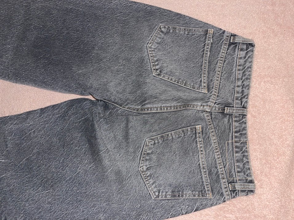 Düğmeli, gri denim kumaştan kadın jean. Sokak stili ve günlük kullanım için uygun, vücuda oturan kesim.