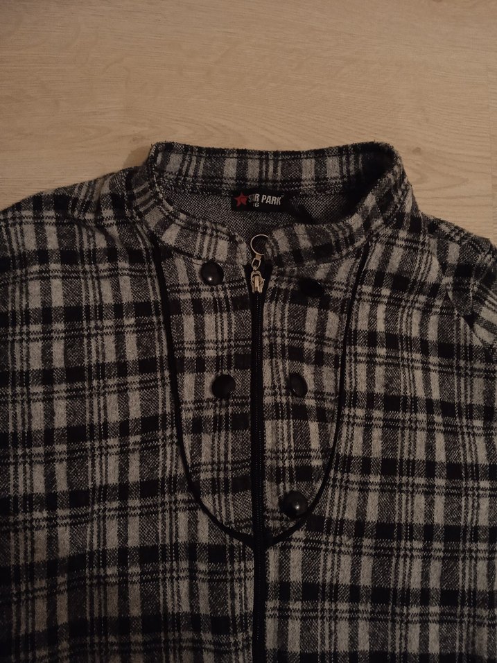 Düğmeli, yüksek yakalı gri kaban. Salaş kesim ve kareli desenle günlük sokak stili için uygundur. Uzun kollu ve normal boyda rahat bir üründür.
