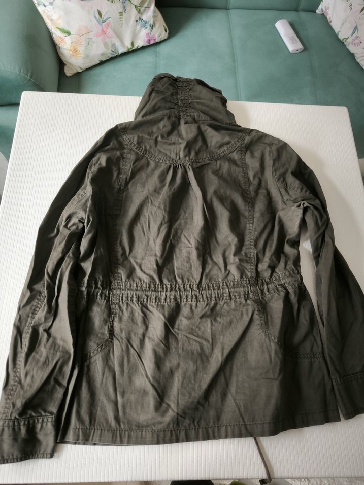 Düğmeli, yüksek yakalı, uzun kollu ve keten kumaştan yapılmış gri renkli kadın ceketi. Orta boy ve sokak tarzına uygun dış mekan kullanımı için ideal.
