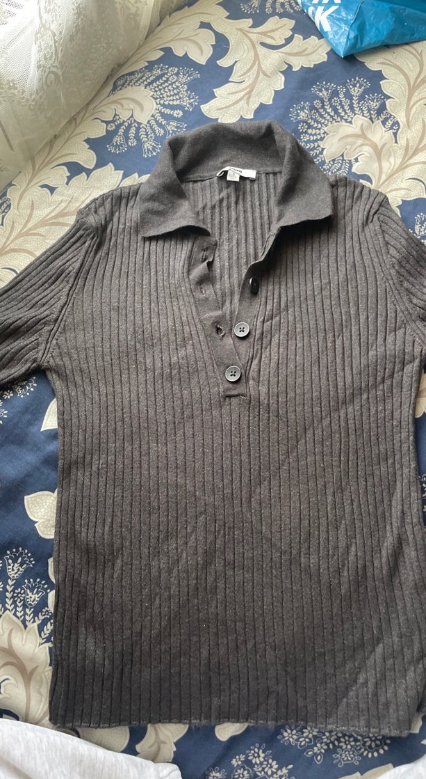 Düğmeli, yakalı, uzun kollu, keten kumaştan yapılmış gri, fit kesim bir kazak. Normal uzunlukta ve rahat günlük kullanım için uygundur.