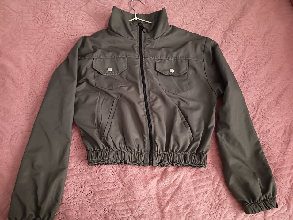 Düğmeli cepleri ve uzun kollu, kısa kesim yapısıyla gri kadın ceketi, sentetik kumaştan üretilmiş, sokak stiline uygun bir üründür.