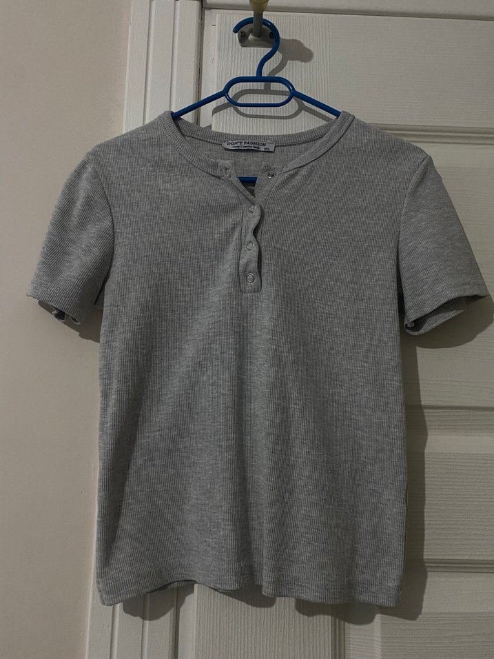 Gri renkte, düğmeli ön kısmı ve bisiklet yaka tasarımı olan kadın kısa kollu tişört. Pamuk kumaştan, rahat ve bol kesimdir. Günlük kullanım için uygundur.