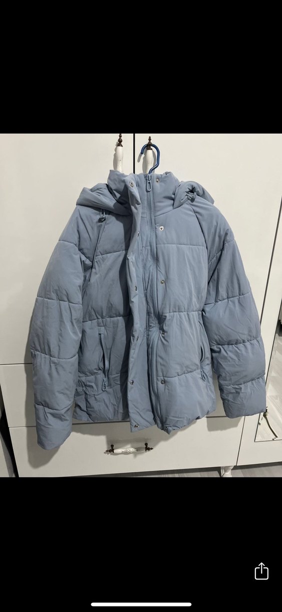 Mavi markalı Düğmeli önü ve kesik yaka detaylı, yumuşak ve sıcak kumaştan yapılmış gri renkli, normal boyda, uzun kollu, rahat kesim kadın kışlık mont. ❄️