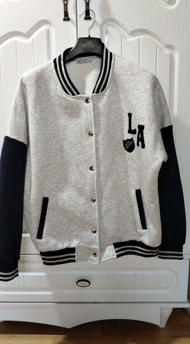 Düğmeli, uzun kollu, gri ve lacivert renkli, baskılı LA detaylı, rahat kesim kadın kolej ceket. Günlük kullanım için uygundur.