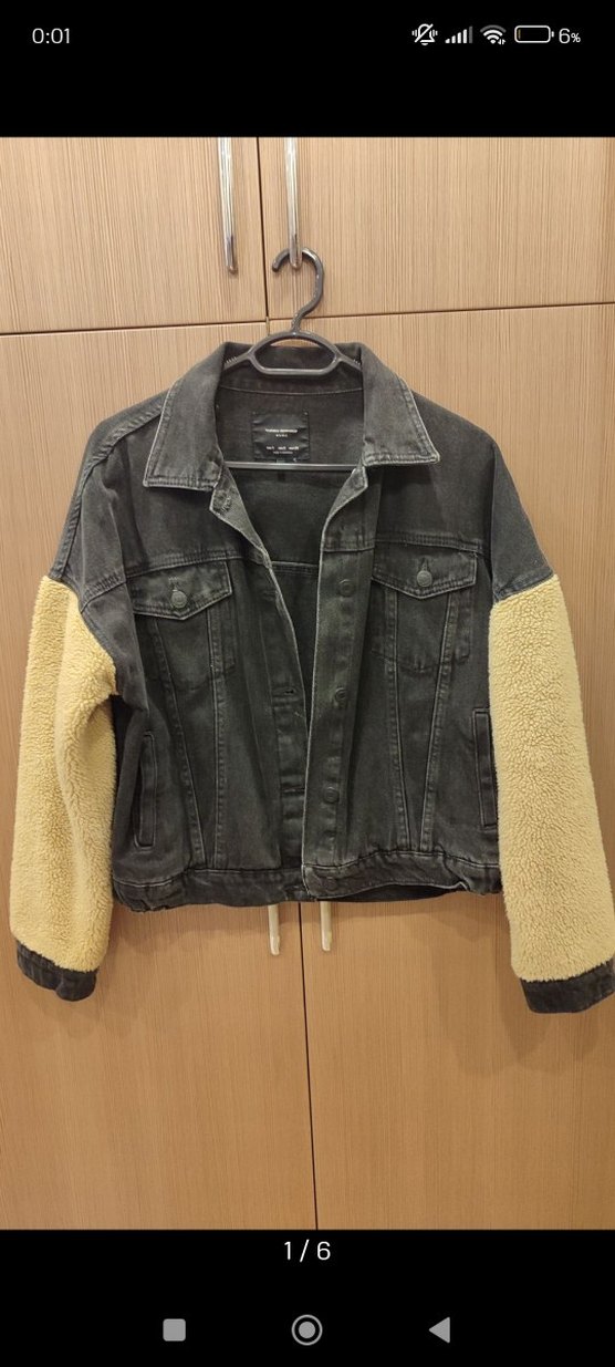 Düğmeli, bol kesim kadın kot ceketi, uzun kollarda yumuşak krem kumaş detaylı, gri renkte, günlük kullanıma uygun. peluş kısmın içi astarlıdır M bedene de uygun