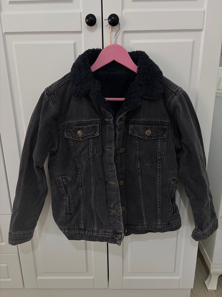 Koyu gri, düğmeli, rahat kesim kot ceket, günlük kullanım için uygun. küçük beden için uygundur