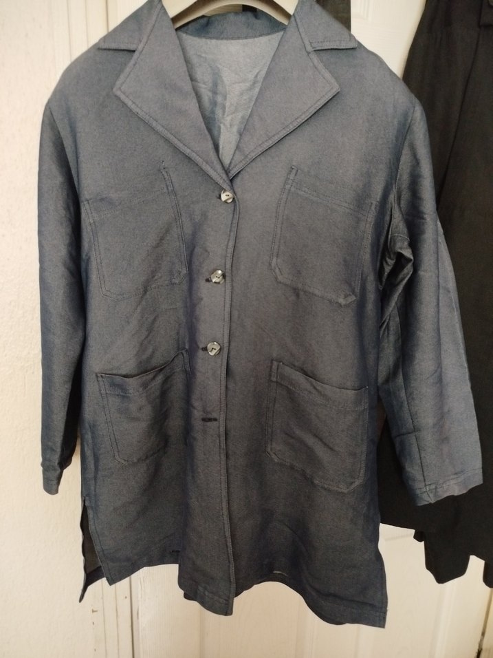 Gri renkte, düğmeli, notched lapel yakalı kadın kot ceket. Normal kesim, uzun kollu ve midi boyda, gündelik kullanıma uygun.