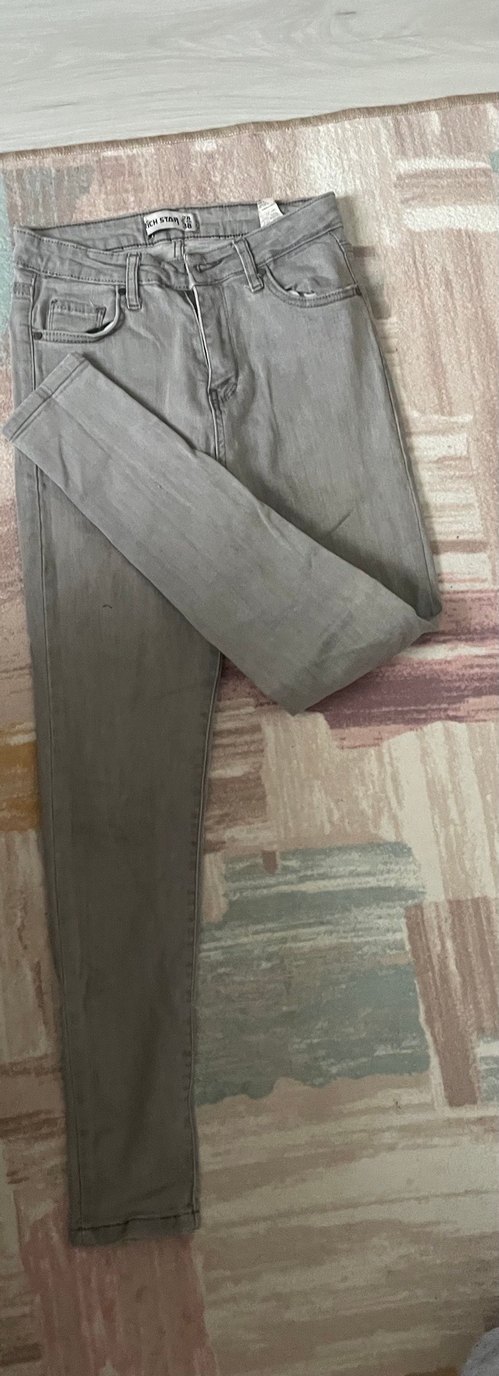 Düğmeli detaylı, normal boy rahat kot gri kadın pantolonu.
