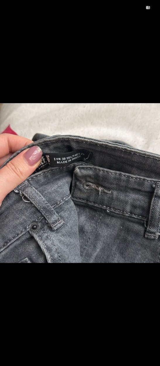 Düğmeli, gri renkli kot pantolon. Sade, midi boyda ve dar kesim olan bu model günlük sokak stiline uygundur.
