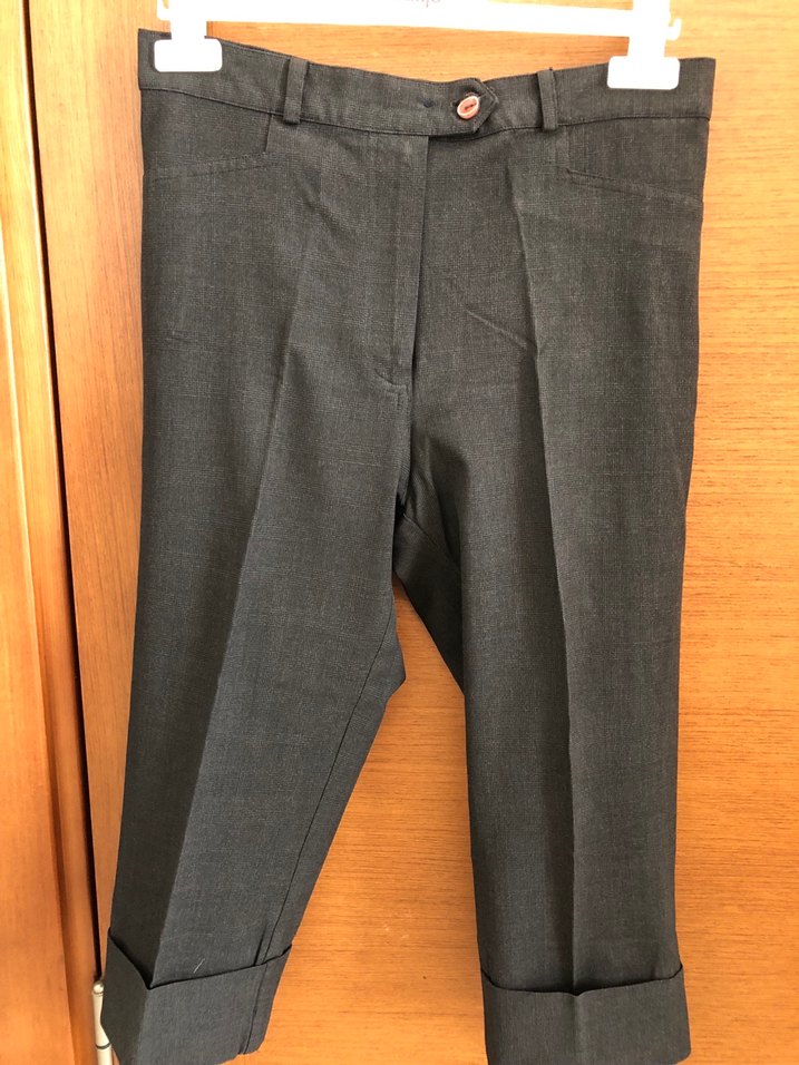 Gri kumaştan yapılmış düğmeli kadın pantolonu, normal midi boyda ve ofis kullanımı için uygun, sade kesim. Bermuda pantolon. Kullanmadığım için satıyorum, #bermuda #kumaş #gri