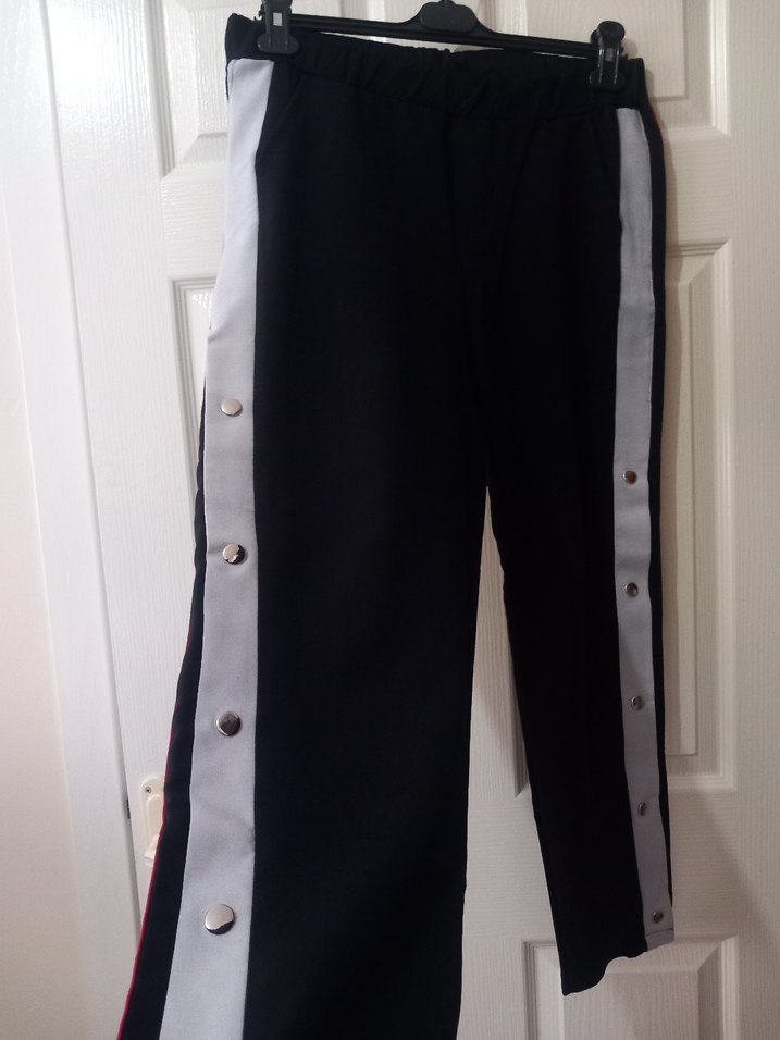Yanları düğmeli, gri renkli kadın kumaş pantolon. Regular kesim ve günlük rahat stil için uygundur.