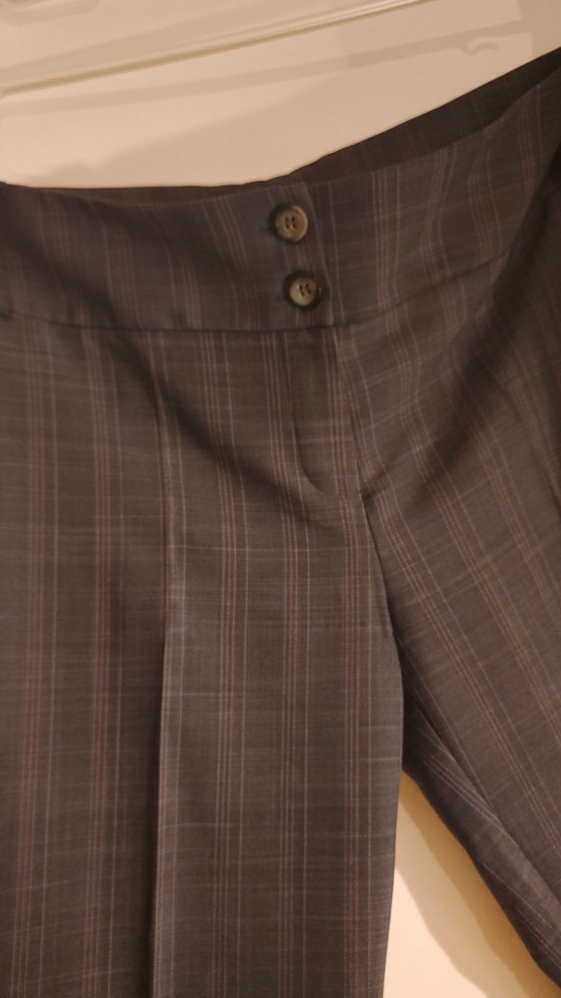 Düğmeli, regular fit gri kadın kumaş pantolon. Ofis için uygun tasarım.