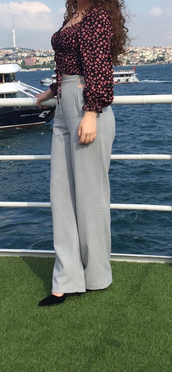 Gri renkli, düğmeli kadın kumaş pantolon. Normal boy ve regular fit kesime sahip, günlük rahat kullanıma uygun. Bel dekolteli, 1-2 defa kullanıldı, herhangi bir defosu yok.