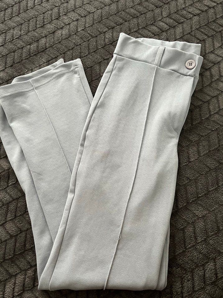 Düğmeli beli ve midi boyu ile gri renk, regular fit kumaş pantolon, günlük kullanım için uygundur.