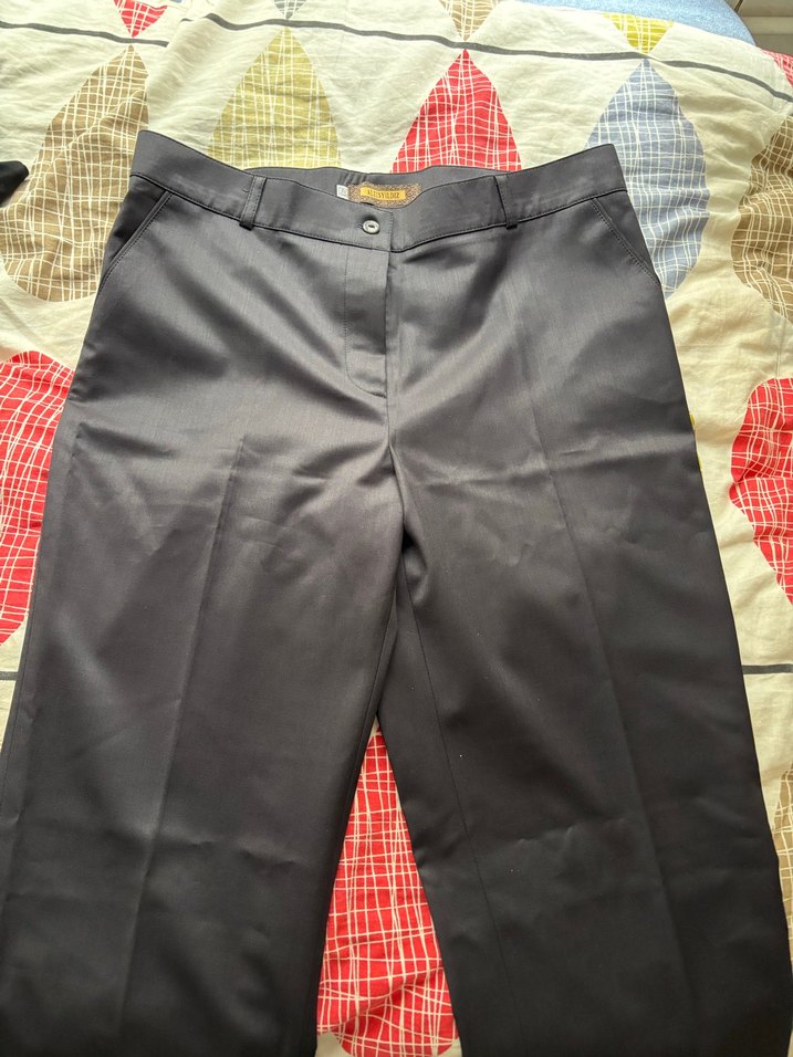 Gri renkte, düğmeli, normal boyda, regular fit kesime sahip kadın kumaş pantolon. Ofis kullanımı için uygun, yumuşak ve parlak dokulu kumaştan.