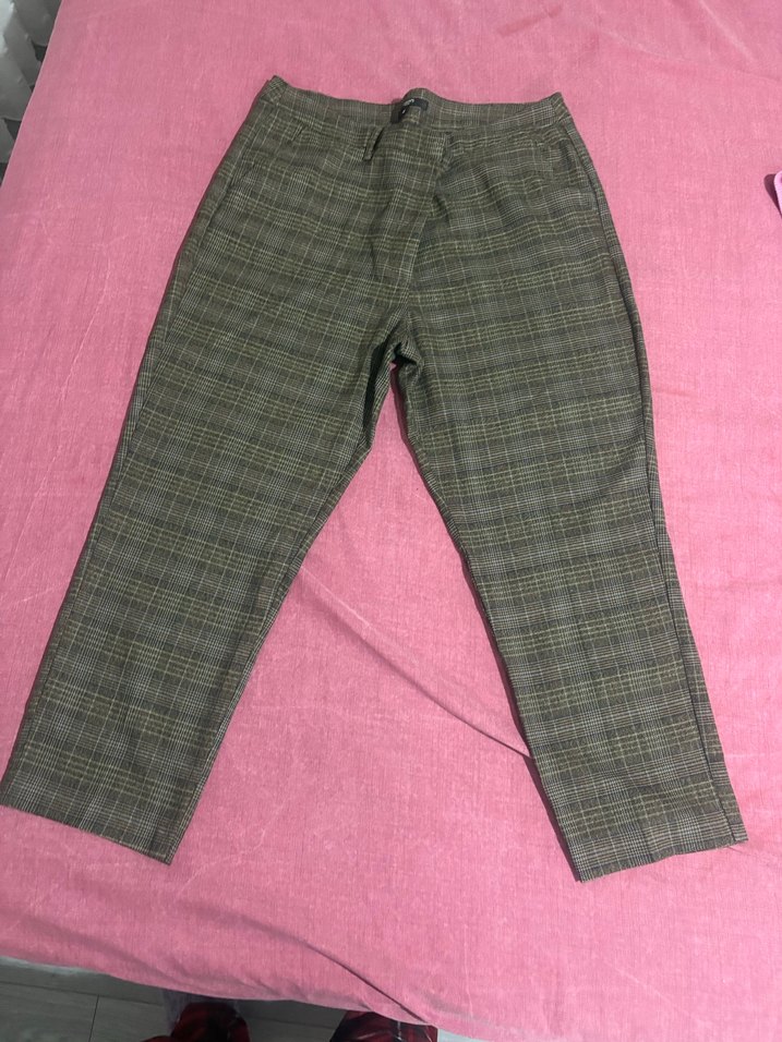 Gri renkte, düğmeli önden kapanışlı, sentetik kumaştan üretilmiş, midi boyda kadın kumaş pantolon.