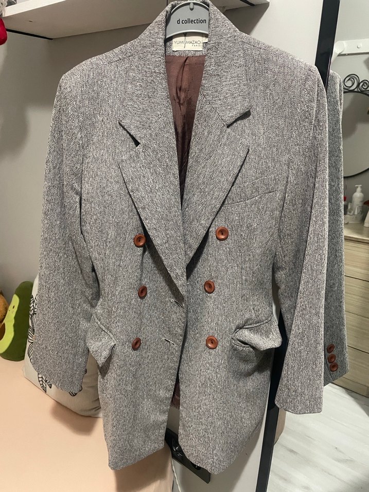Gri yün kumaştan düğmeli, yaka detaylı uzun kollu midi uzunlukta kadın blazer ceket. Ofis kullanımı için uygun sade tasarım.