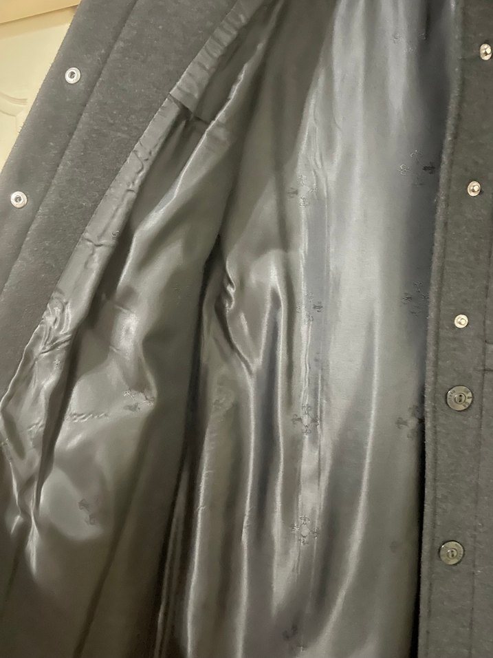 Gri renkli, düğmeli erkek kaban, notched lapel yakalı, sentetik kumaş, normal boy ve regular fit, uzun kollu, günlük sokak stili için uygun.
