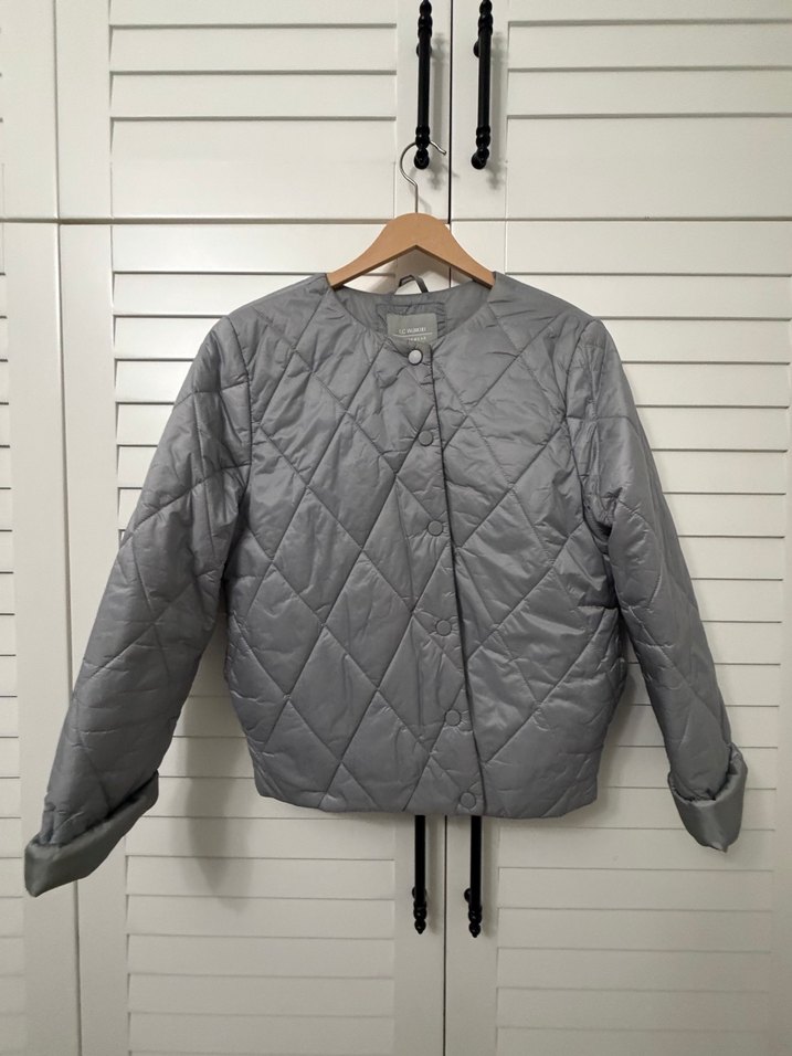 Gri renkli kadın ceketi, düğmeli ve yuvarlak yaka tasarımıyla dikkat çeker. Rahat kesimi ve orta boy uzunluğu günlük kullanım için uygundur.