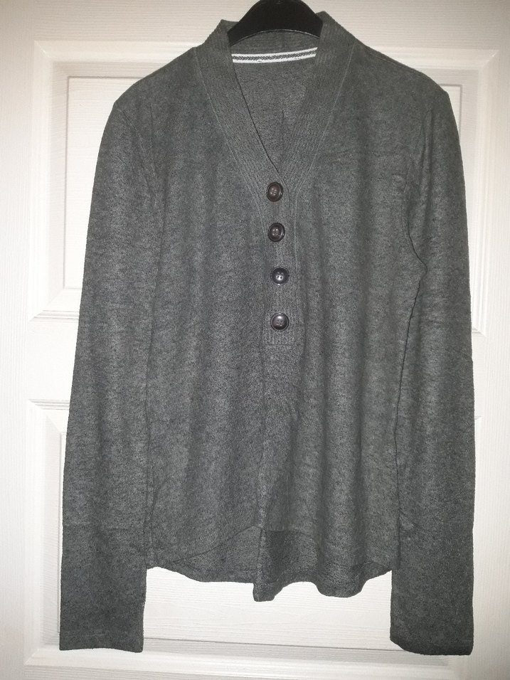 Düğmeli, gri yün hırka, uzun kollu ve kesik yakalıdır. Rahat kesim ve midi boyda, ofis için şık ve rahat bir tercihtir.