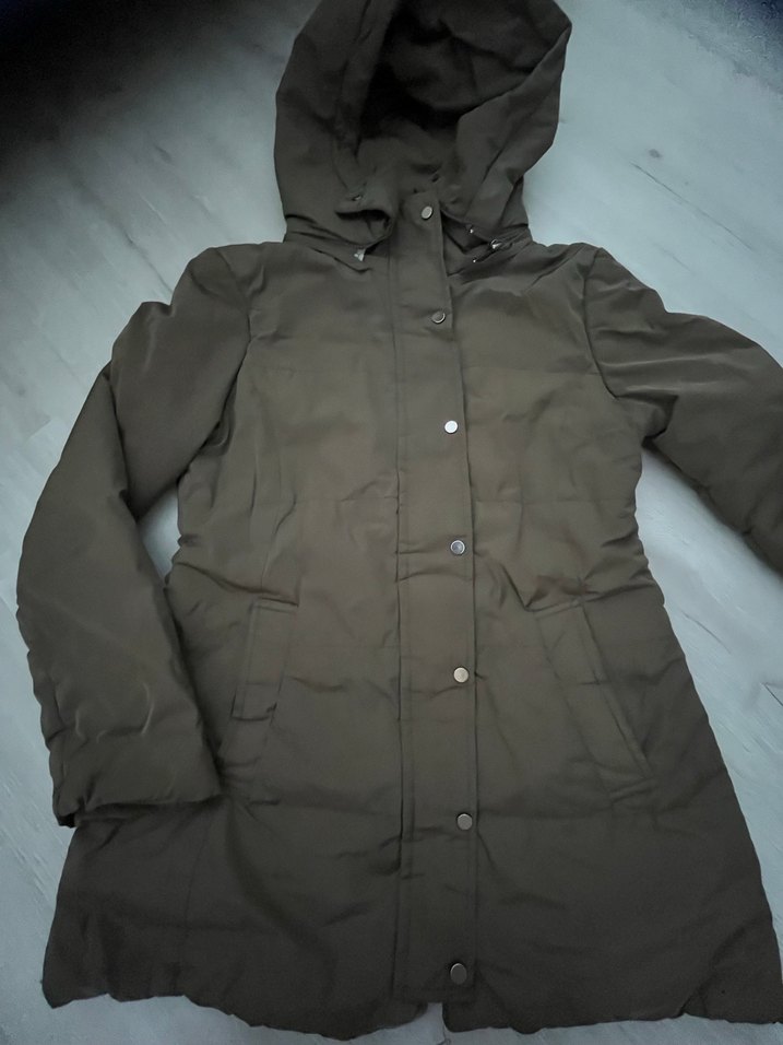 Düğmeli ön kısmı ve uzun kollu, sentetik kumaştan yapılmış gri, kadınlara özel, midi boy, rahat sokak stili mont.