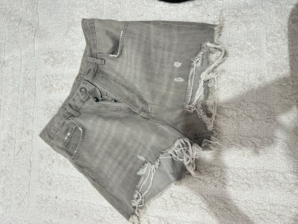 Düğmeli, bol kesim gri mini denim şort, yıpranmış detaylarla günlük rahat sokak stili için uygundur.
