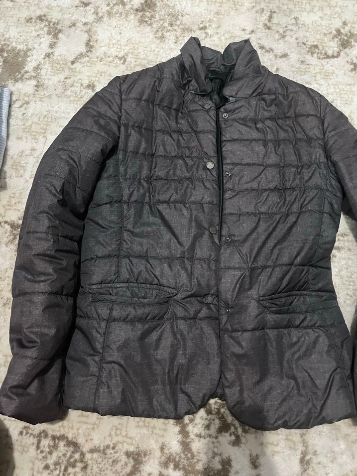 Düğmeli ön, kesik yaka ve uzun kollu gri kadınmont . İnce, rahat keten kumaştan, sokak modasına uygun, normalkısa boyda ve günlük kullanım için ideal.