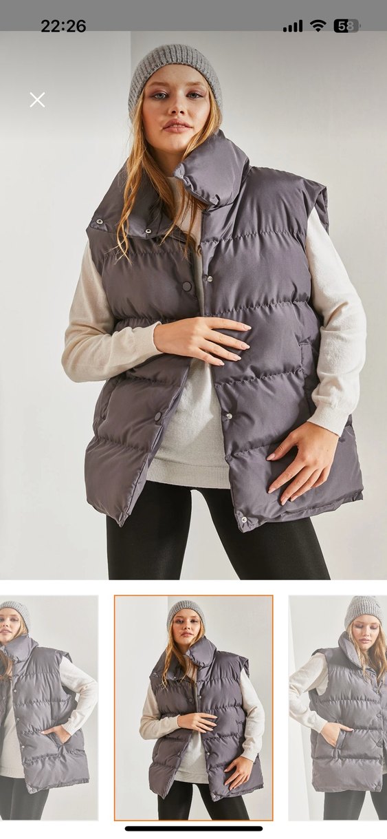 Düğmeli, yüksek yakalı gri şişme yelek, bol kesim ve midi boyda, sentetik kumaştan, sokak tarzına uygun.
