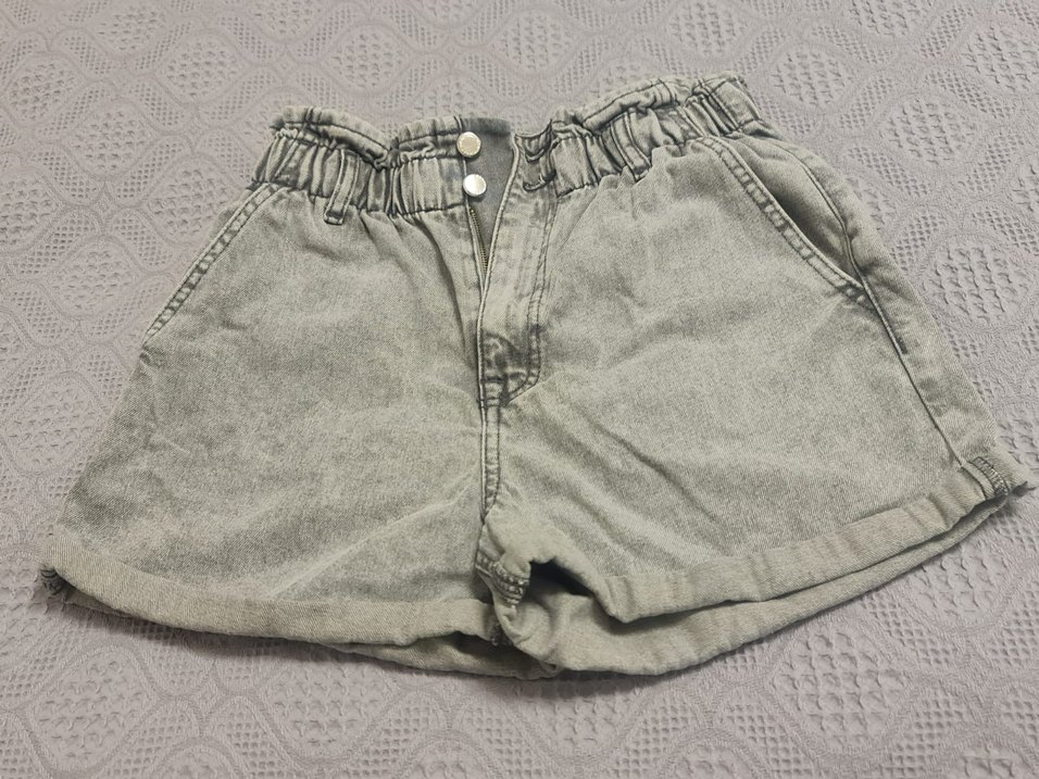 Düğmeli ön kısmı ve lastikli bel detayına sahip gri renkli,yüksel bel kot şort.