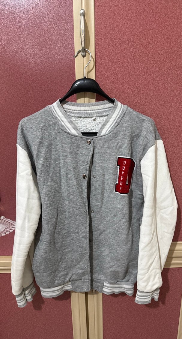 Gri renkli, düğmeli, uzun beyaz kollu, bol kesim kadın sweatshirt. Yuvarlak yakalı ve göğüs kısmında baskılı patch detayı bulunur.