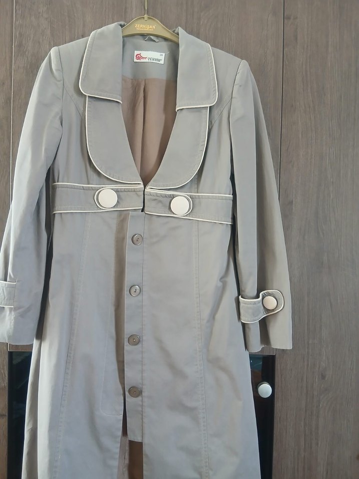 Uzun boy, düğmeli gri trençkot, kırmalı yaka ve uzun kollu. Düz ve düzenli kesim, ofis için uygun. Çok az kullanıldı Sorunu yok