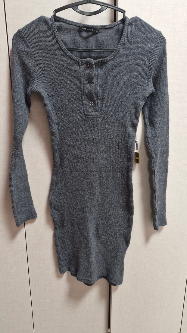 Düğmeli detaylı, uzun kollu, gri triko elbise. Midi boyda, rahat ve sade tarzda günlük kullanıma uygun.