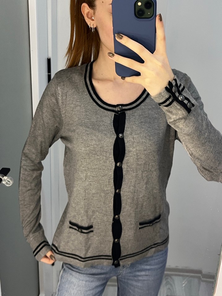 Düğmeli, kruvaze yaka, siyah şerit detaylı gri triko hırka. Uzun kollu, midi boy ve dar kesimdir. Günlük sokak stili için uygundur. 60boy 45 en