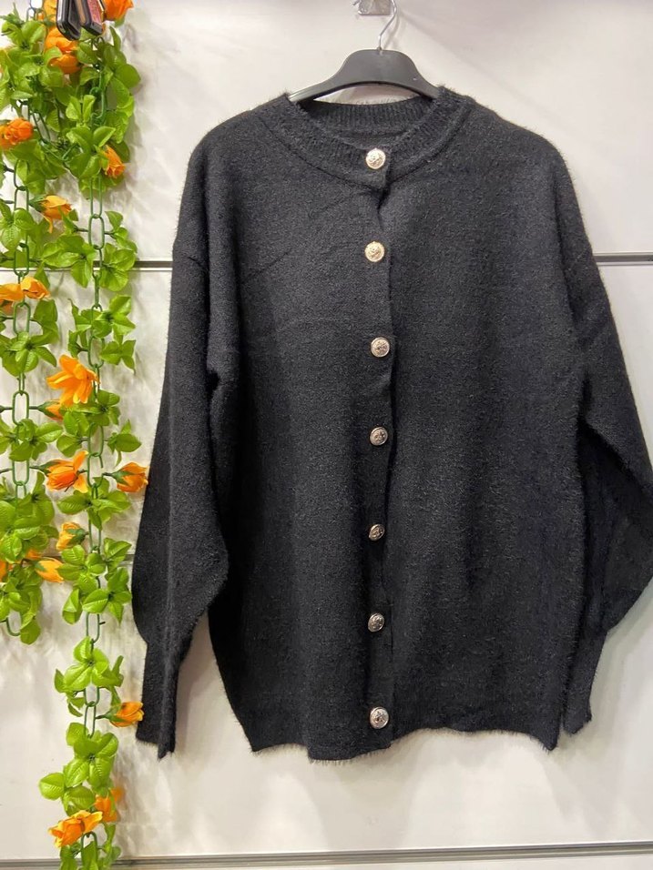 Düğmeli, uzun kollu, yuvarlak yakalı gri triko hırka. Bol kesim ve midi boyda, günlük kullanım için uygun.