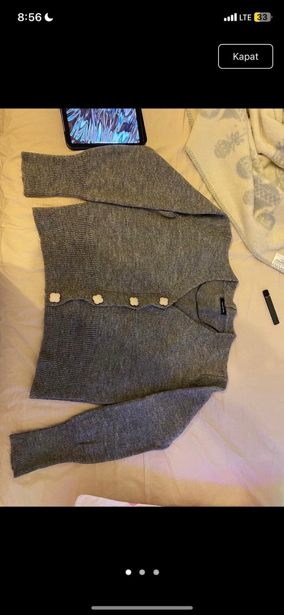 Düğmeli, uzun kollu, gri triko hırka. Normal uzunlukta, ince kesim ve yakasında kesik detay bulunur. Günlük kullanıma uygundur.