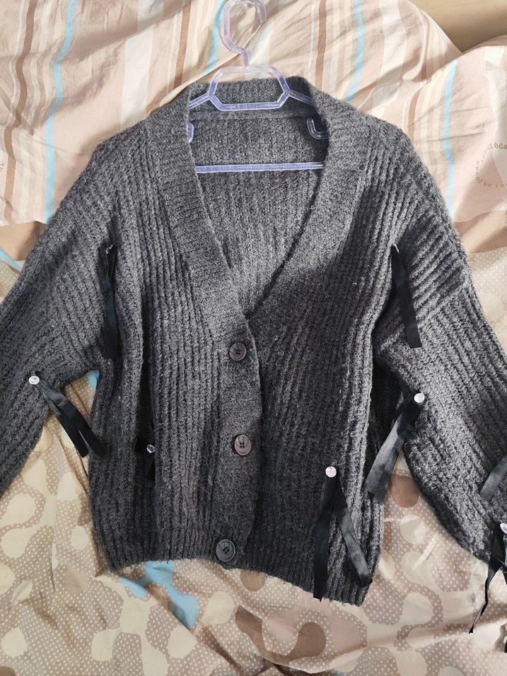 Gri renkte, düğmeli ve uzun kollu triko kadın hırka. Notlu yaka ve bol kesim, midi boyuyla rahat bir stil sunar.